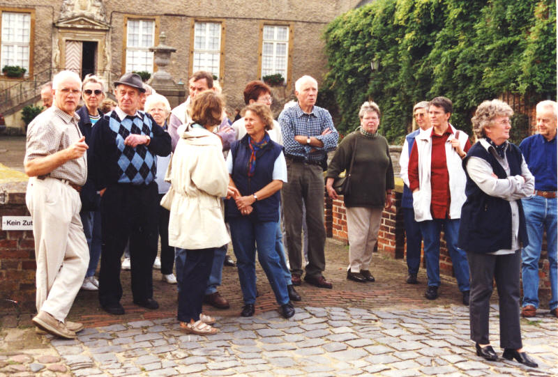 Zum festen Programm des Heimatvereins Warendorf gehört eine jährliche Radtour unter dem Motto "Besuch bei unseren Nachbarn". Am 29.9.2001 bildete das Dorf Ostenfelde das Ziel, wo die Warendorfer vom Vorsitzenden des Ostenfelder Heimatvereins Klemens Senger - auf dem Bild ganz links - durch den Ort und durch Schloss Vornholz geführt wurden.
